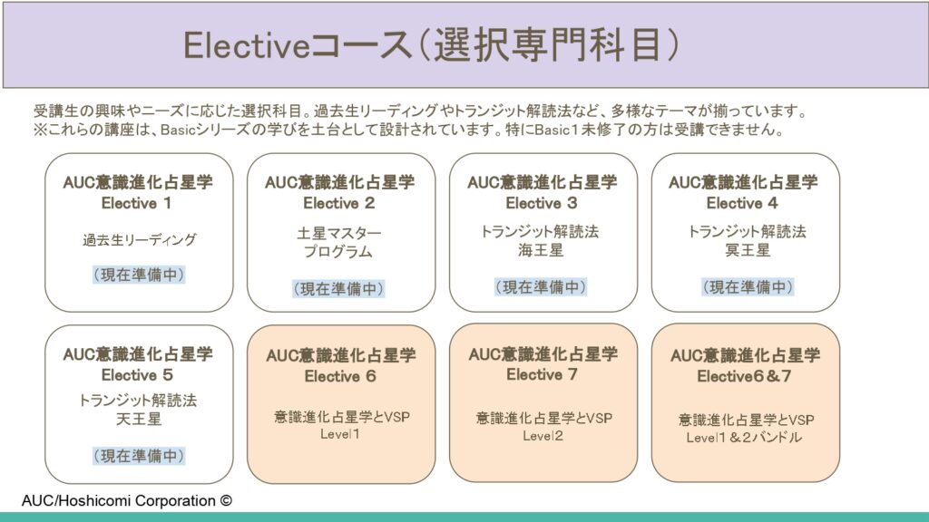 受講生の興味やニーズに応じた選択科目。過去生リーディングやトランジット解読法など、多様なテーマが揃っています。
